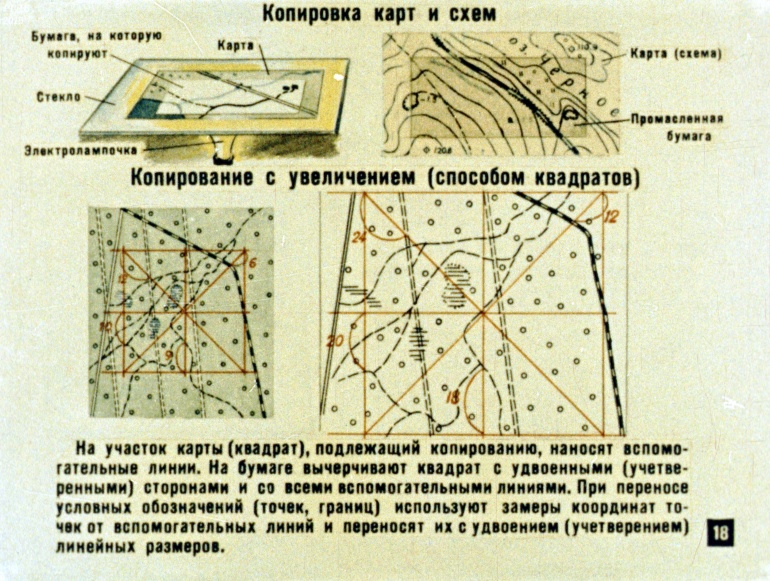 На участок карты (квадрат), подлежащий копированию, наносят вспомогательные линии. На бумаге вычерчивают квадрат с удвоенными (учетверенными) сторонами и со всеми вспомогательными линиями. При переносе условных обозначений (точек, границ) используют замеры координат точек от вспомогательных линий и переносят их с удвоением (учетверением) линейных размеров.