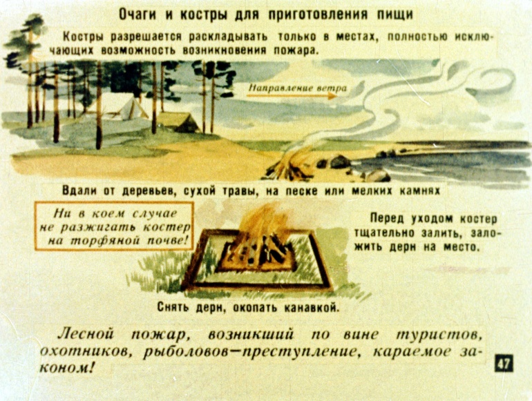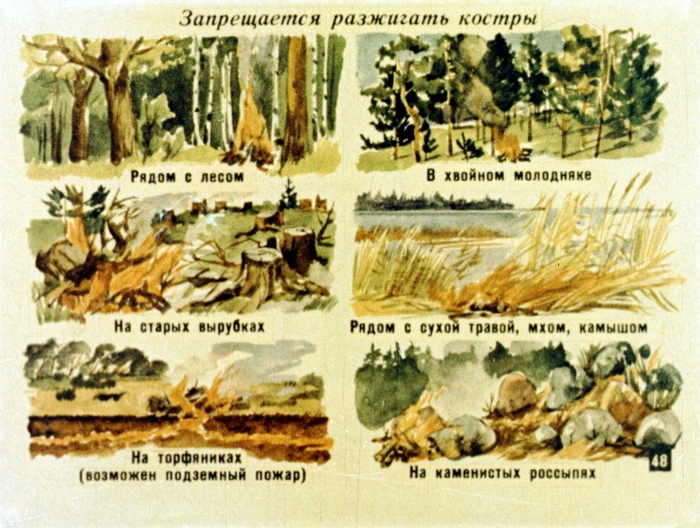 - Костры разрешается раскладывать только в местах, полностью исключающих возможность возникновения пожара.