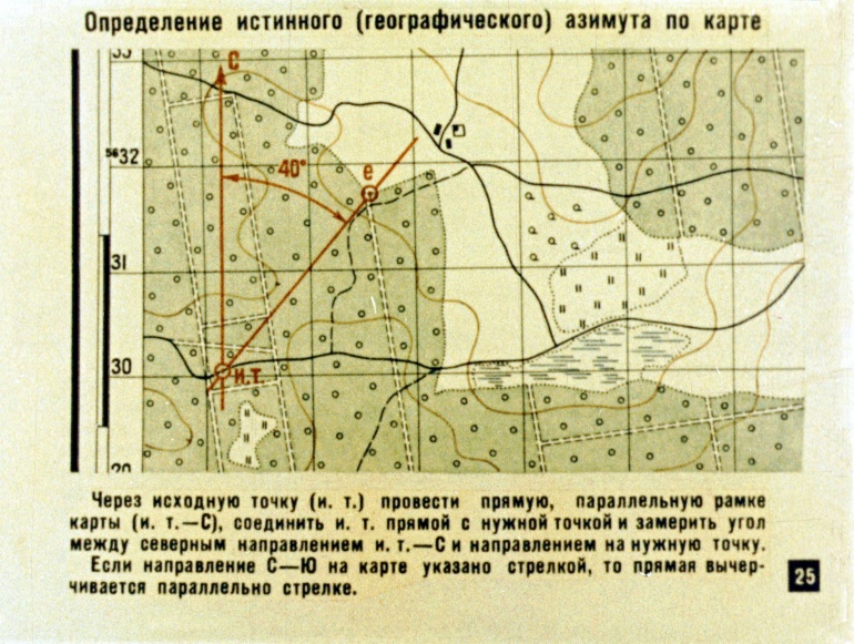 Через исходную точку (и. т.) провести прямую, параллельную рамке карты (и. т.—С), соединить и. т. прямой с нужной точкой и замерить угол между северным направлением и. т.—С и направлением на нужную точку.