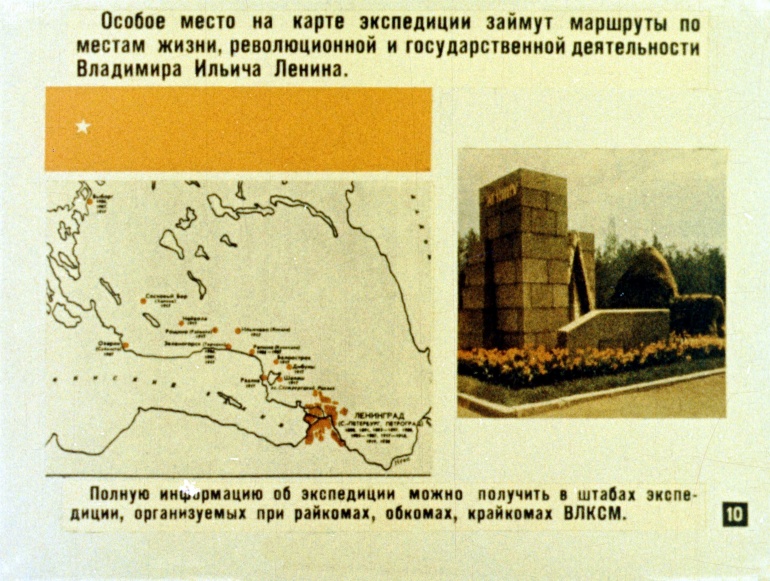 Особое место на карте экспедиции займут маршруты по местам жизни, революционной и государственной деятельности Владимира Ильича Ленина. Полную информацию об экспедиции можно получить в штабах экспедиции, организуемых при райкомах, обкомах, крайкомах ВЛКСМ.