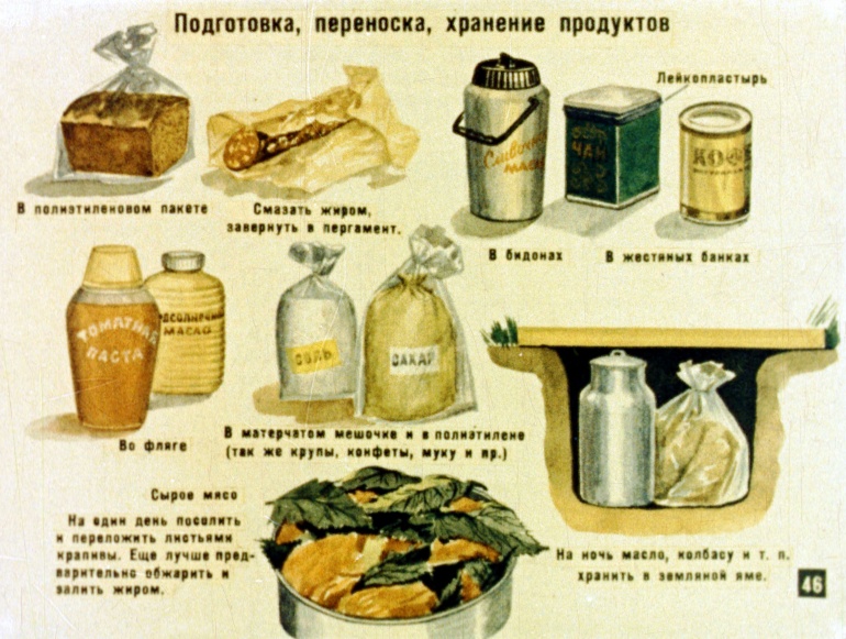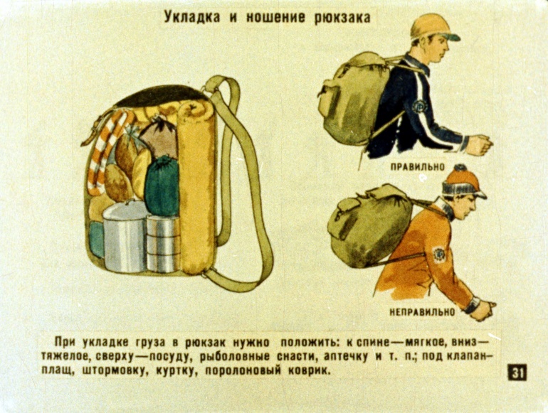 При укладке груза в рюкзак нужно положить: к спине—мягкое, вниз— тяжелое, сверху—посуду, рыболовные снасти, аптечку и т. под клапан-плащ, штормовку, куртку, поролоновый коврик.
