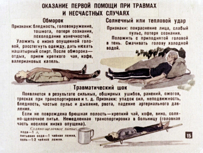 Признаки: бледность, головокружение, тошнота, потеря сознания, похолодание конечностей. Уложить с низко опущенной головой, расстегнуть одежду, дать нюхать нашатырный спирт. После обморока — отдых, прием крепкого чая, кофе, валериановых капель.