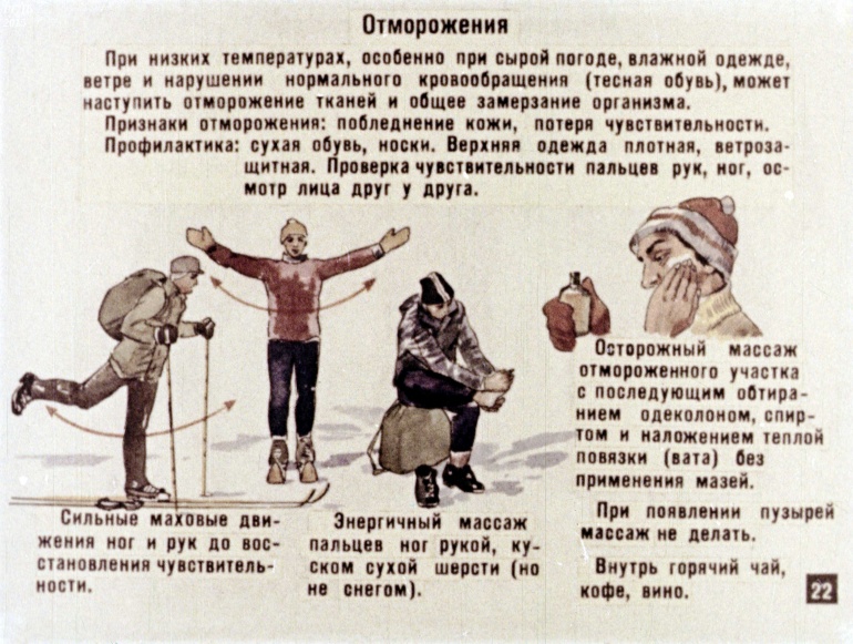 При низких температурах, особенно при сырой погоде, влажной одежде, ветре и нарушении нормального кровообращения (тесная обувь), может наступить отморожение тканей и общее замерзание организма.