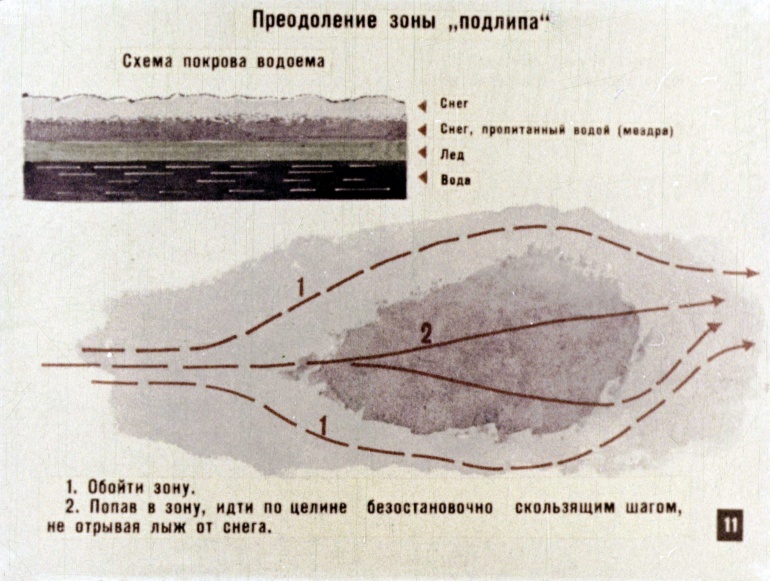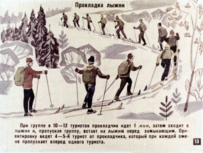 При группе в 10—12 туристов прокладчик идет 1 мин, затем сходит с лыжни и, пропуская группу, встает на лыжню перед замыкающим. Ориентировку ведет 4—5-й турист от прокладчика, который при каждой смене пропускает вперед одного туриста.