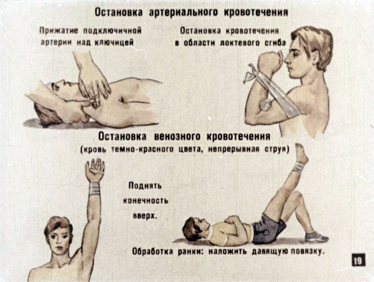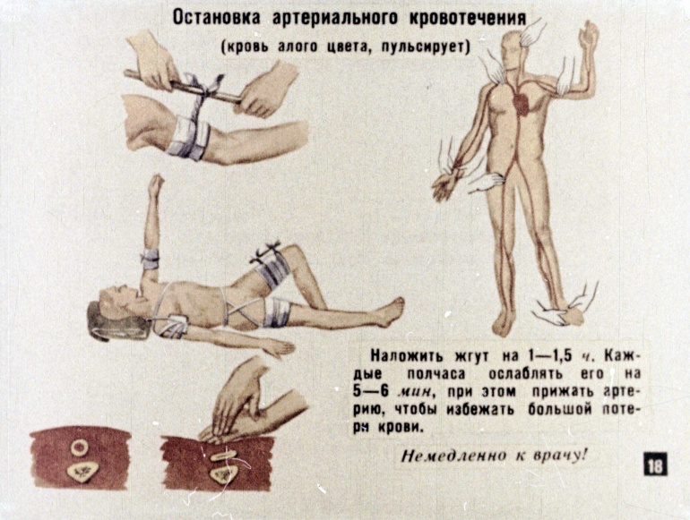 Остановка артериального кровотечения (кровь алого цвета, пульсирует)