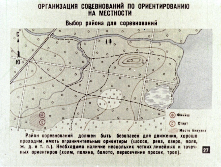 Район соревнований должен быть безопасен для движения, хорошо проходим, иметь ограничительные ориентиры (шоссе, реиа, озеро, поле, ж. д. и т. п.). Необходимо наличие нескольких четких линейных и точечных ориентиров (холм, поляна, болото, пересечение просек, троп).