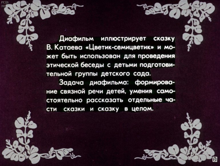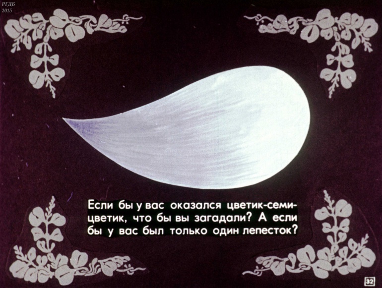 Цветик-семицветик (1981) 0 Категория: ДиафильмыПросмотры: 1 051 В. Катаев. Диафильм "Цветик-семицветик". Версия 1981 годаСтудия "Диафильм" Госкино СССР, 1981 год. Д-009-81, цветной 0-30 копеек