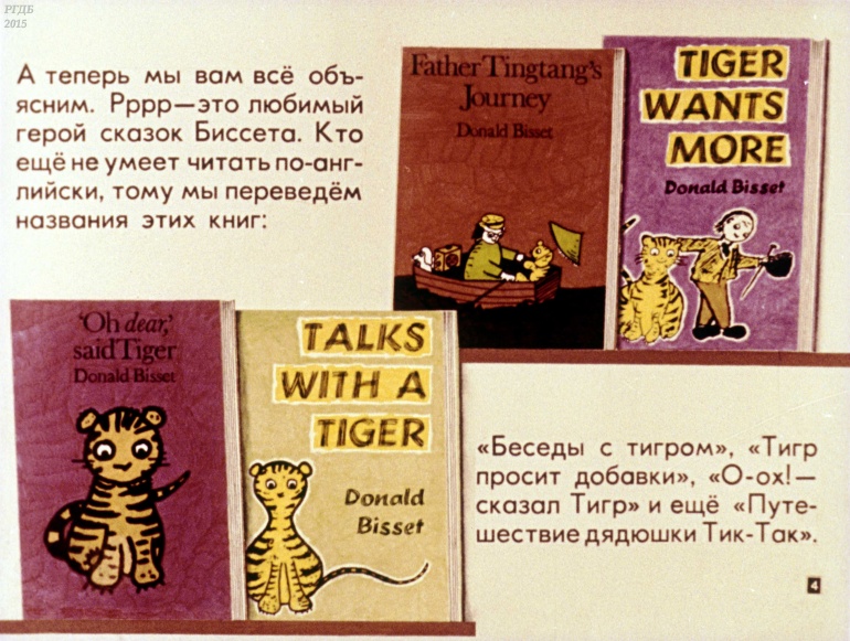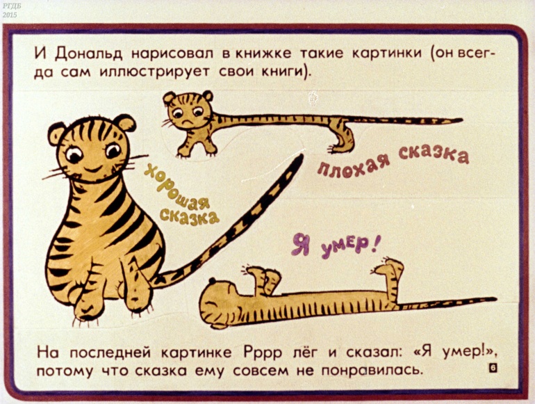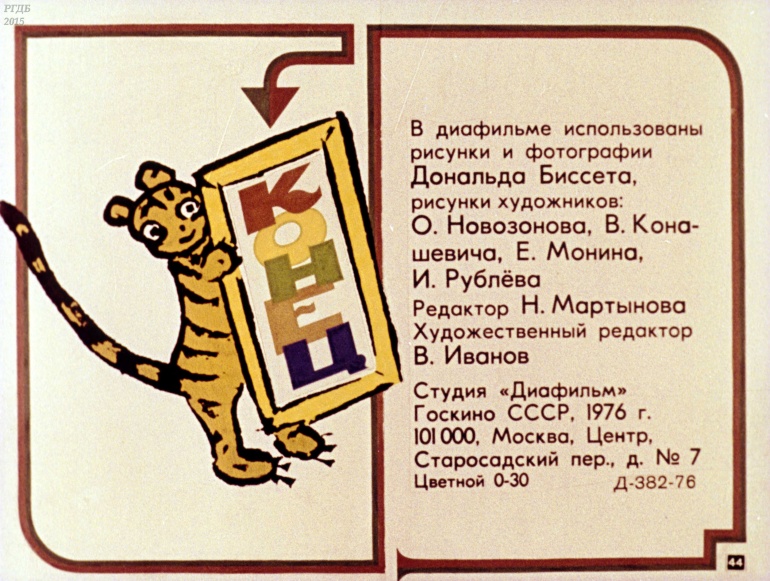 Что думает тигр о Дональде Биссете 1 Категория: ДиафильмыПросмотры: 849 Н. Шерешевская. Диафильм "Что думает тигр о Дональде Биссете".Студия "Диафильм" Госкино СССР, 1976 год. Д-382-76, цветной 0-30 копеек