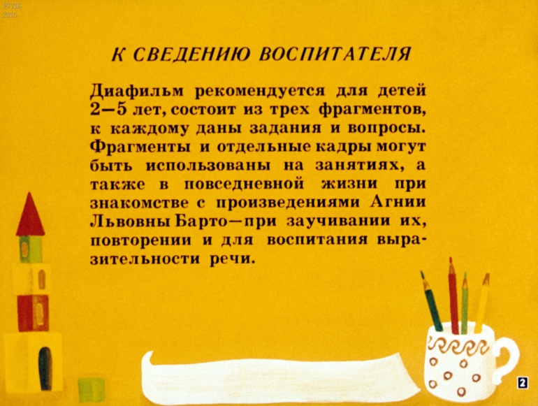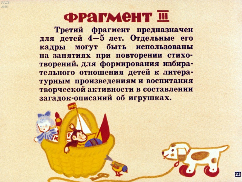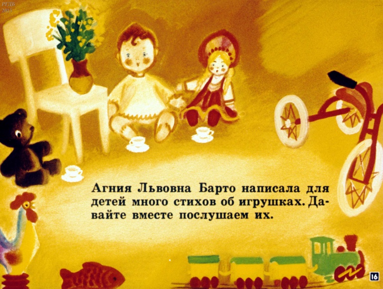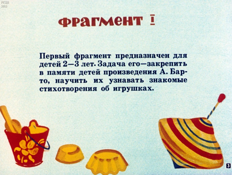 Я люблю свои игрушки 1 Категория: ДиафильмыПросмотры: 1 413 А. Барто. Диафильм для детских садов. "Я люблю свои игрушки".Студия "Диафильм" Госкино СССР, 1990 год. Д-046-90