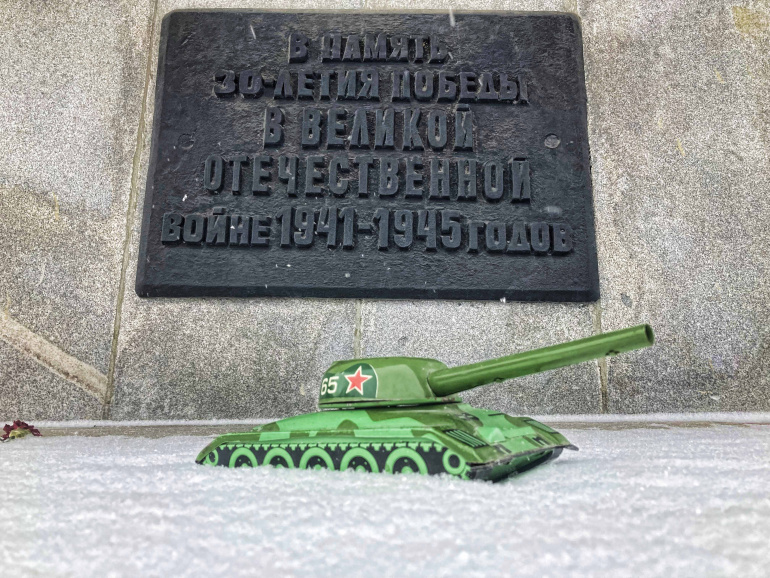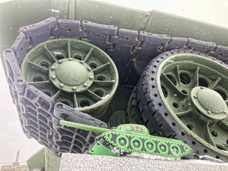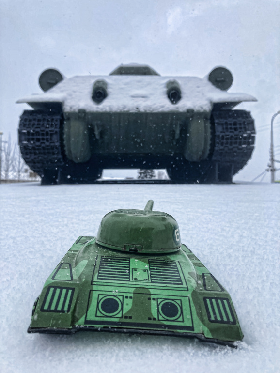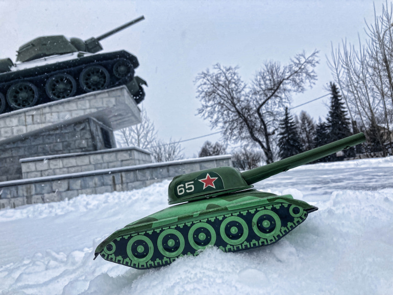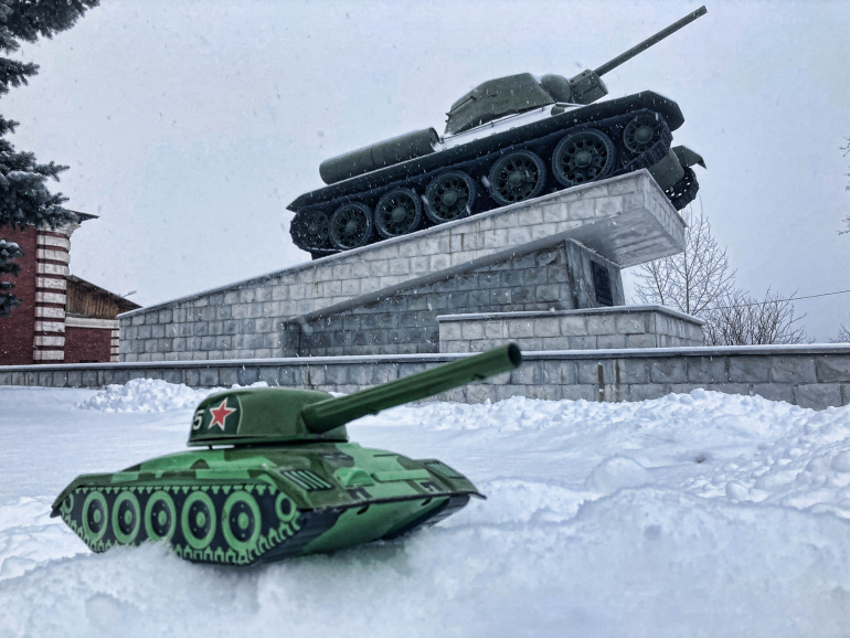 Вот так встретились дед - Т-34 и внук - металлическая игрушка фирмы Радуга.