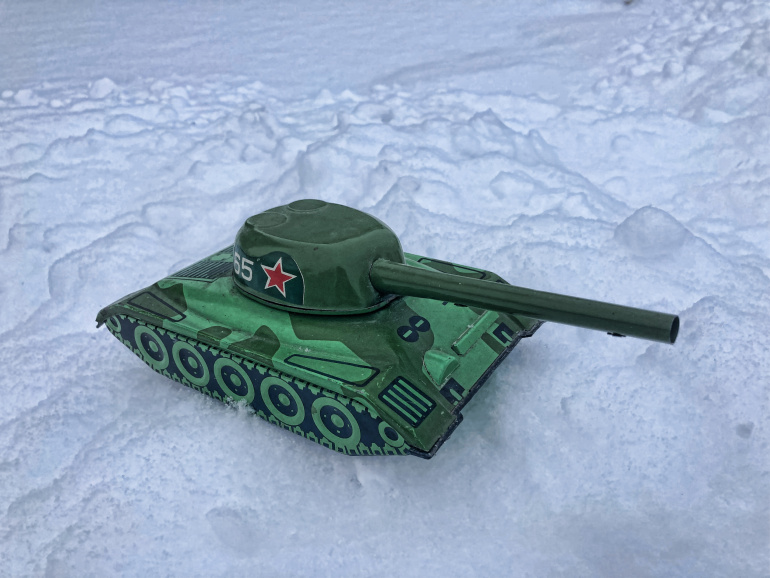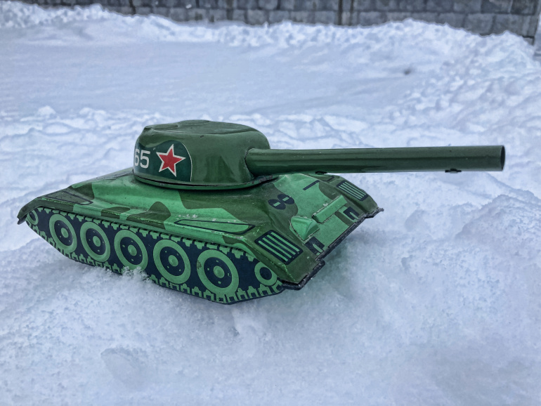 Эта электромеханическая игрушка получает движение от микроэлектродвигателя. При движении танка башня поворачивается вправо и влево. Наталкиваясь на препятствия, танк разворачивается и продолжает двигаться.