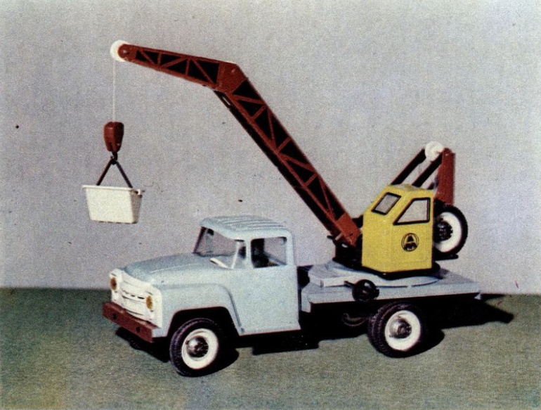 Игрушка металлическая. Кабина изготавливается из полистирола. Поворот крана, подъем груза, подъем и опускание стрелы осуществляются штурвалами. Размеры: 410 X 150 X 195 мм. Артикул ЛГ-085-8308
