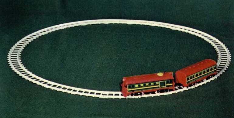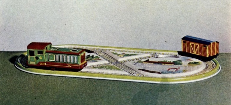 Игрушка заводная. Корпус локомотива, вагон и колея изготавливаются из полистирола. Размеры при собранной колее: 900 X 725 X 64 мм. Артикул ЛГ 085-3025