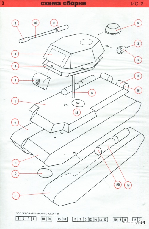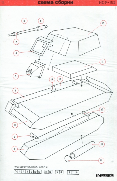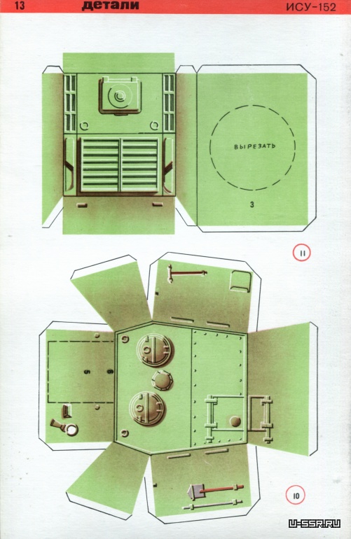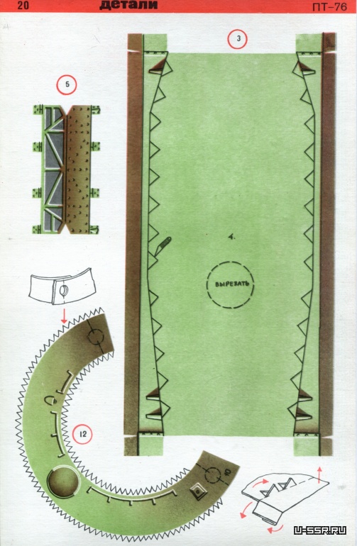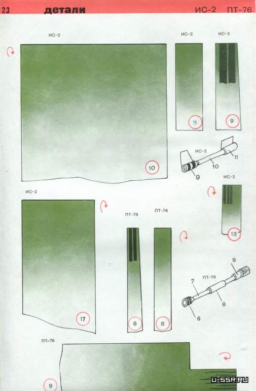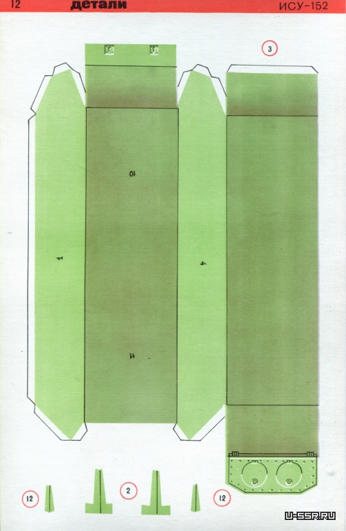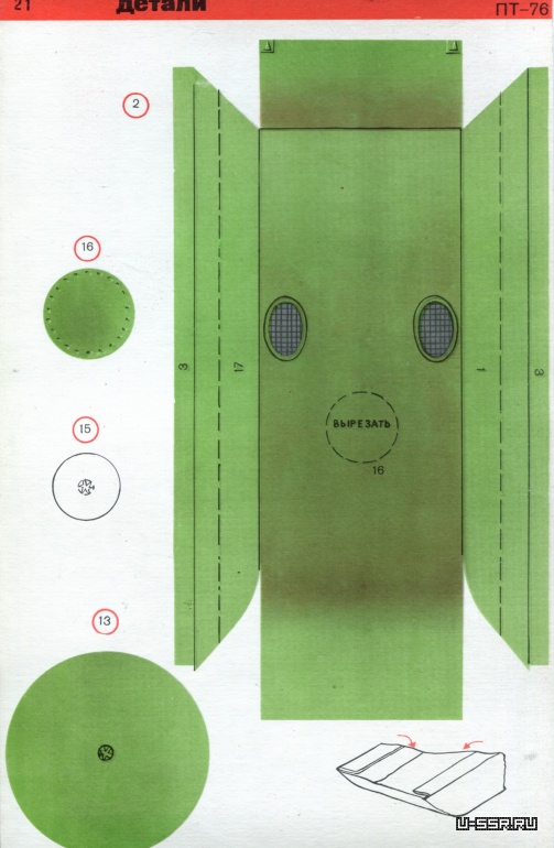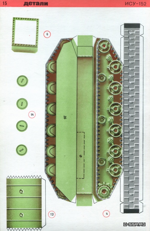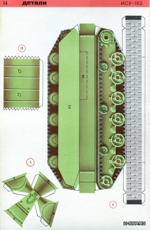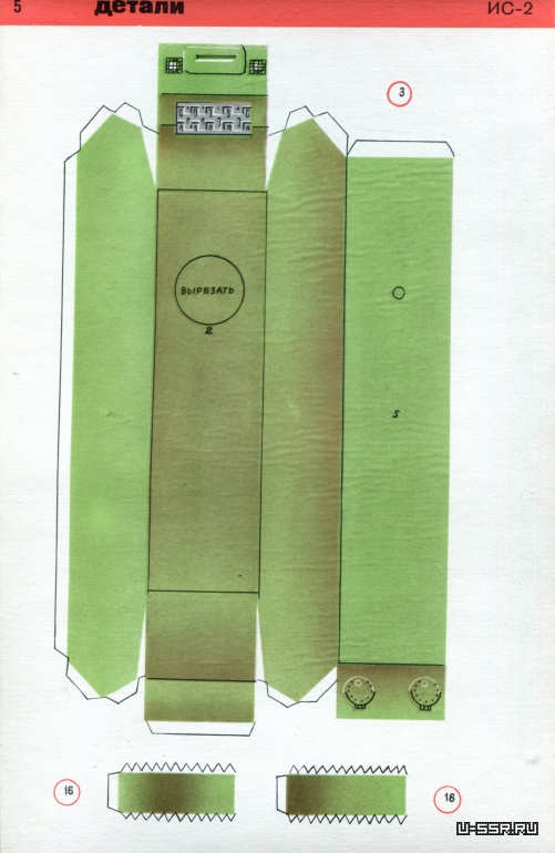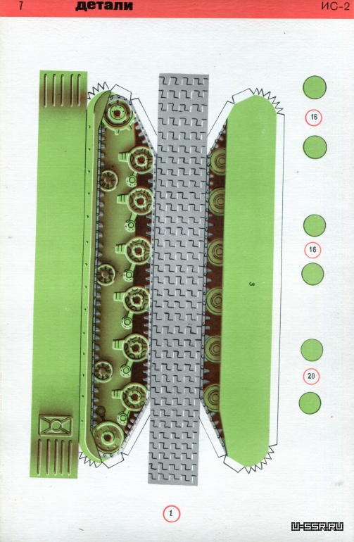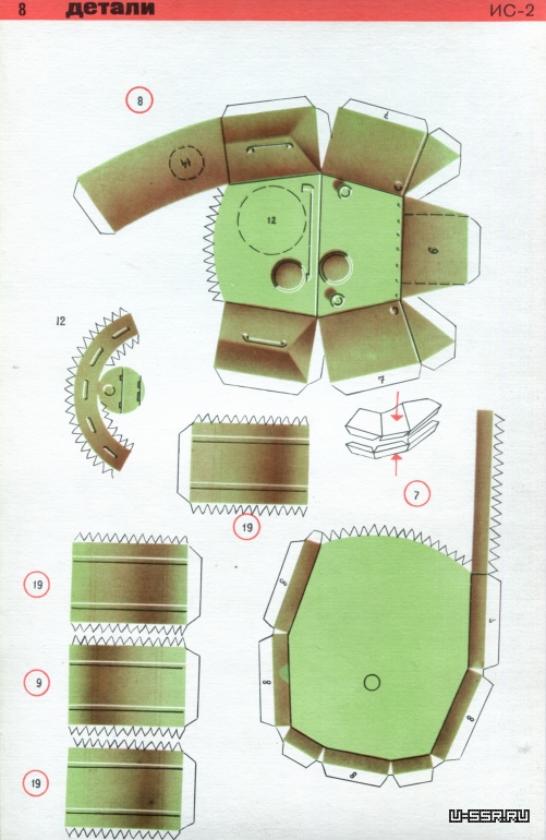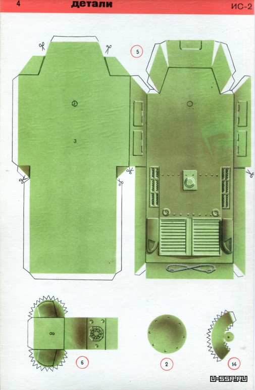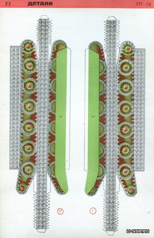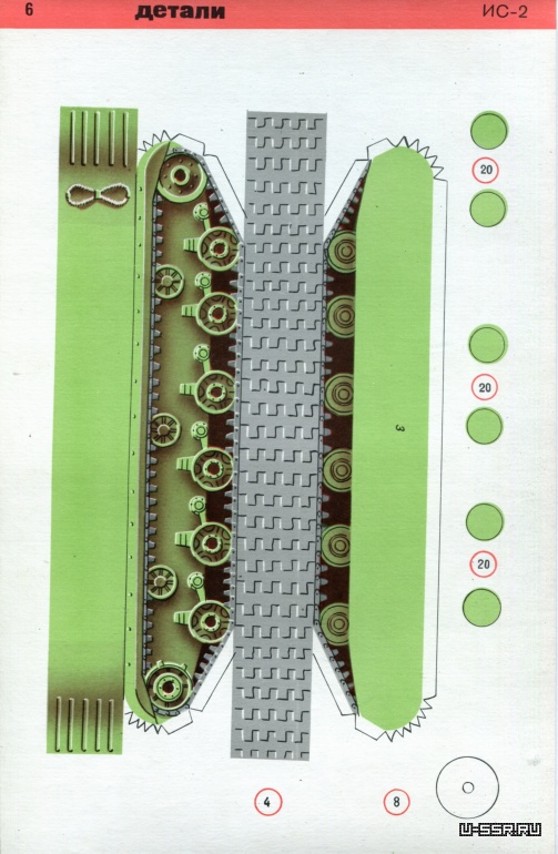 Зібравши таким чином гусениці, приклейте їх до корпусу одночасно з обох боків, перевіряючи паралельність на площині стола. Круглі деталі (гармати, кулемети, осі башт) надруковані на тонкому папері. Вирізавши смужку, обкрутіть II навколо олівця, а потім згорніть в трубочку. Клеєм змащуйте тільки останній виток.