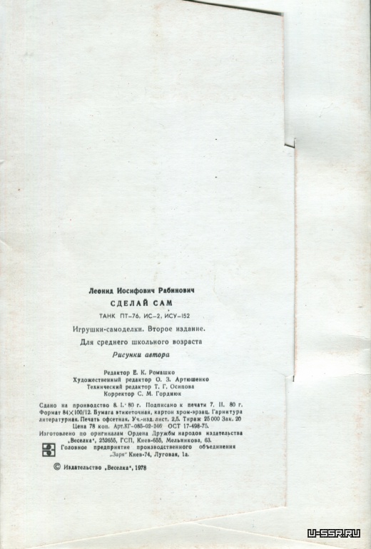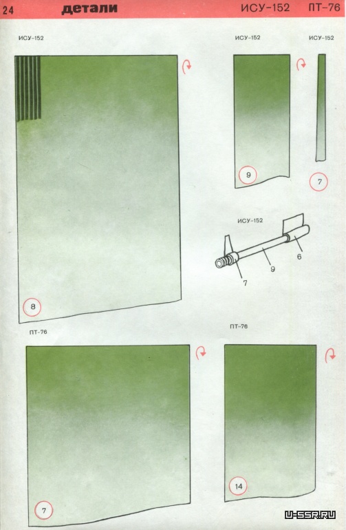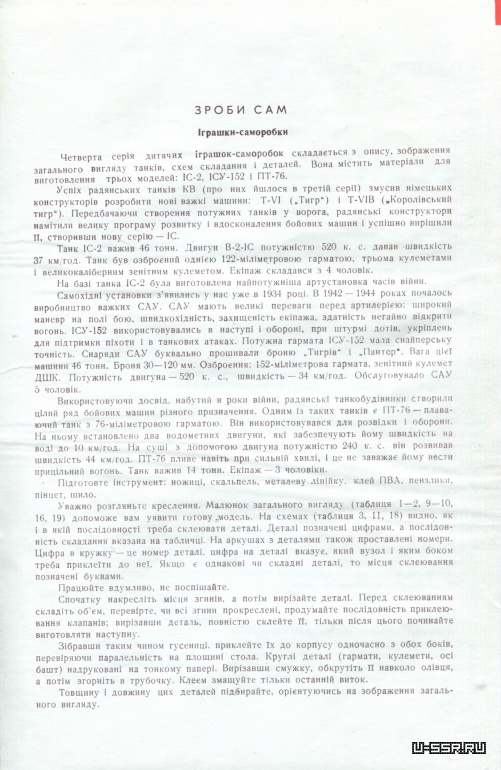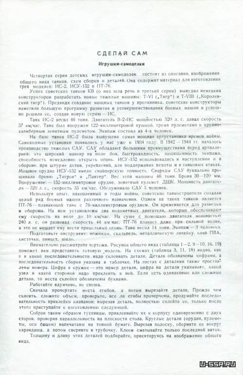 Четвертая серия детских игрушек-самоделок состоит из описания, изображения общего вида танков, схем сборки и деталей. Она содержит материал для изготовления трех моделей: ИС-2, ИСУ-152 и ПТ-76.