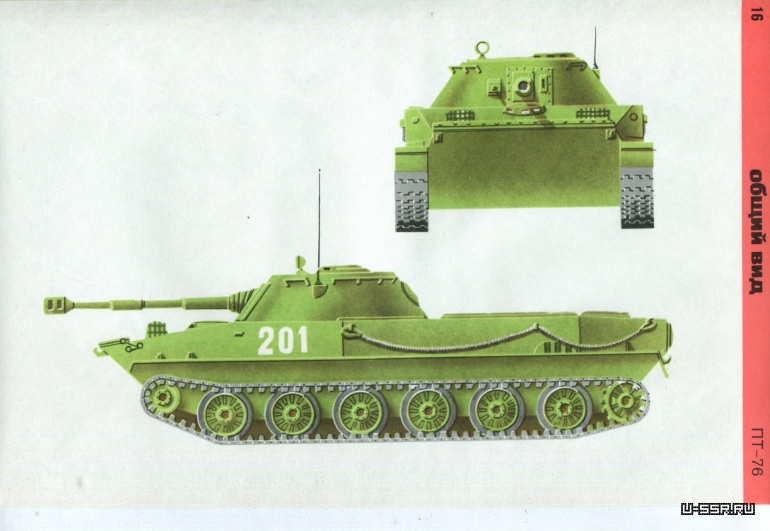 Використовуючи досвід, набутий в роки війни, радянські танкобудівники створили цілий ряд бойових машин різного призначення. Одним із таких танків є ПТ-76 — плаваючий танк з 76-міліметровою гарматою. Він використовувався для розвідки і оборони. На ньому встановлено два водометних двигуни, які забезпечують йому швидкість на воді до 10 км/год. На суші з допомогою двигуна потужністю 240 к. с. він розвивав швидкість 44 кмігод. ПТ-76 пливе навіть при сильній хвилі, І це не заважає йому вести прицільний вогонь. Танк важив 14 тонн. Екіпаж — 3 чоловіки.