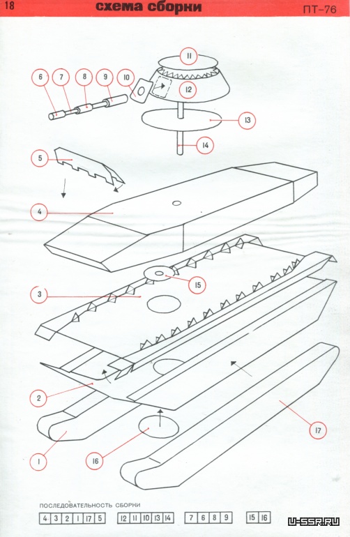Уважно розгляньте креслення. Малюнок загального вигляду (таблиця 1—2, 9—10, 16, 19) допоможе вам уявити готову .модель. На схемах (таблиця 3, 11, 18) видно, як і в якій послідовності треба склеювати деталі. Деталі позначені цифрами, а послідовність складання вказана на табличці. На аркушах з деталями також проставлені номери. Цифра в кружку — це номер деталі, цифра на деталі вказує, який вузол і яким боком треба приклеїти до неї. Якщо є однакові чи складні деталі, то місця склеювання позначені буквами.